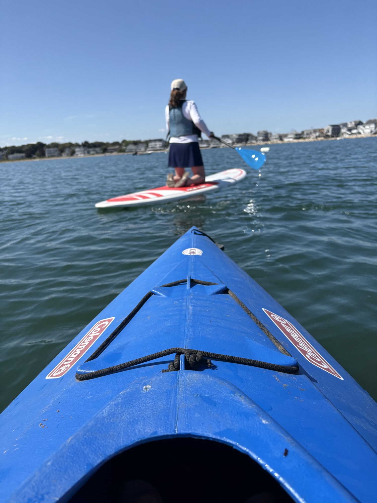 Over lunch, we decided to take a paddle in the harbor together. Stacey took to the paddle board while I returned to the kayak. It was high tide under a beautiful blue sky. We were in no hurry, and naturally ended up on the sandy part of seaglass beach. Our reward for taking another walk there was a few more pieces of seaglass to add to our collection, and some lovely sea air.
